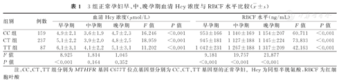 3组受试者早孕期血清Hcy浓度及早、中、晚孕期RBCF水平分别比较,差异均有统计学意义(P<0.05);3组受试者中、晚孕期血清Hcy浓度分别比较,差异均无统计学意义(P>0.05)。CC组受试者早、中、晚孕期血清Hcy浓度、RBCF水平分别比较,差异均有统计学意义(P<0.05);CT组、TT组的这2个指标早、中、晚孕期分别比较,差异亦均有统计学意义(P<0.05)。3组受试者早、中、晚孕期血清Hcy浓度与RBCF水平比较,见表1。
