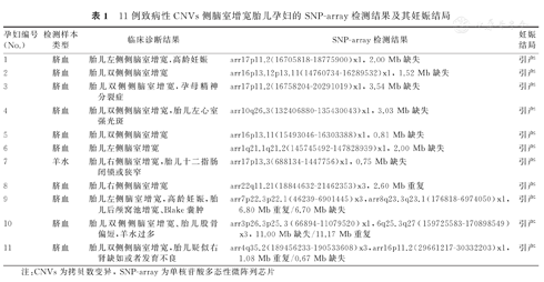 11例致病性CNVs侧脑室增宽胎儿孕妇的SNP-array检测结果及其妊娠结局