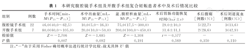 | 组别 | 例数 | 手术时间[min,M(P25~P75)] | 术中出血量[mL,M(P25~P75)] | 盆、腹腔积血量[mL,M(P25~P75)] | 术后胃肠功能恢复时间(h, ±s) | 术后腹痛[例数(%)] | 术后阴道流血[例数(%)] |