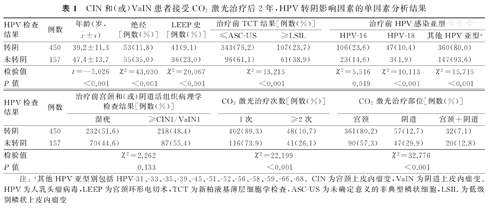 CIN和(或)VaIN患者接受CO2激光治疗后2年,HPV转阴影响因素的单因素分析结果