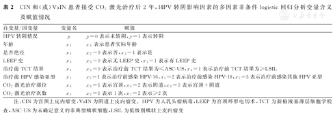 CIN和(或)VaIN患者接受CO2激光治疗后2年,HPV转阴影响因素的多因素非条件logistic回归分析变量含义及赋值情况