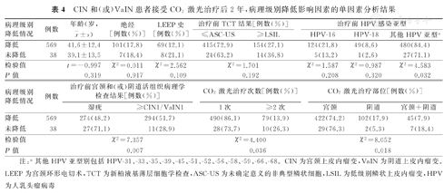 CO2激光治疗CIN和(或)VaIN有效。CIN和(或)VaIN患者接受CO2激光治疗后,HPV转阴、病理级别降低受不同因素影响。