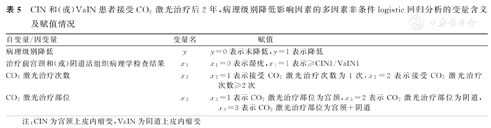 CIN和(或)VaIN患者接受CO2激光治疗后2年,病理级别降低影响因素的多因素非条件logistic回归分析的变量含义及赋值情况