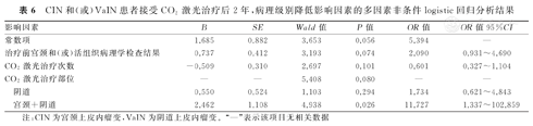 根据已有研究结果并结合临床经验,以及对CO2激光治疗后2年,患者病理级别降低影响因素的单因素分析结果中差异有统计学意义(P<0.05)的3项因素,包括治疗前宫颈和(或)阴道活组织病理学检查结果、CO2激光治疗次数与部位,进行多因素非条件logistic回归分析,其变量含义及赋值情况,见表5。分析结果显示,CO2激光治疗部位为宫颈+阴道(OR=11.727,95%CI:1.337~102.859,P=0.026)是CIN和(或)VaIN患者接受CO2激光治疗后2年,病理级别降低的独立影响因素,见表6。
