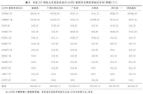 根据本组227例G6PD基因突变受试者的突变位点进行祖籍追溯的结果显示,福建省、广西壮族自治区、广东省、江西省、四川省、其他地区者分别为43、39、35、34、30与46例,其前2位突变位点分别为1376G>T与1388G>A,1388G>A与1376G>T,871G>A与1024C>T,1388G>A与871G>A,1024C>T与1376G>T。本组227例G6PD基因突变携带者地区分布,见表3。