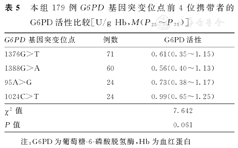 本组179例前4位G6PD基因突变位点(1376G>T、1388G>A、95A>G、1024C>T)携带者的G6PD活性比较,差异无统计学意义(P>0.05)。本组179例G6PD基因突变位点前4位携带者的G6PD活性比较,见表5。