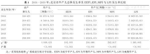 选择2014年1月1日至2019年12月31日,于北京市医疗机构住院分娩的79 173例早产儿为研究对象。其中,各年出生的早产儿分别为11 355、9 549、15 983、14 674、13 790与13 822例;出生胎龄<28周的极早早产儿(extremely early preterm infants,EEPI),出生胎龄≥28~32周的早期早产儿(early preterm infants,EPI),出生胎龄≥32~34周的中期早产儿(medium preterm infants,MPI),出生胎龄≥35~37周的晚期早产儿(late preterm infants,LPI)分别为1 021、7 858、9 102、61 192例。本研究遵循的程序符合首都医科大学附属北京妇产医院伦理委员会制定的标准,经过该伦理委员会批准(审批文号:IEC-C-03-V04-FJ2)。