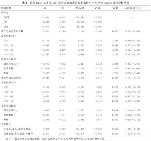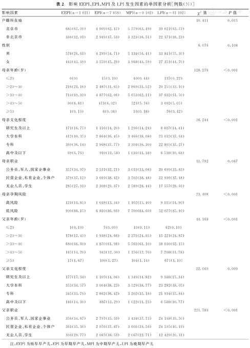 ±s表示,2组比较采用成组t检验,3组及以上比较,采用单因素方差分析。对于计数资料,如早产儿发生率、早产儿家庭人口学特征构成比、围生结局发生率等,采用百分比(%)表示,组间比较,采用χ2检验。采用多因素非条件有序多分类logistic回归分析,对影响EEPI、EPI、MPI及LPI发生的因素进行分析。所有统计学检验采用双侧检验,以P<0.05表示差异有统计学意义。