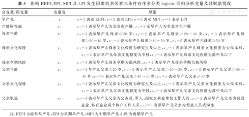 影响EEPI、EPI、MPI及LPI发生因素的多因素非条件有序多分类logistic回归分析变量及其赋值情况