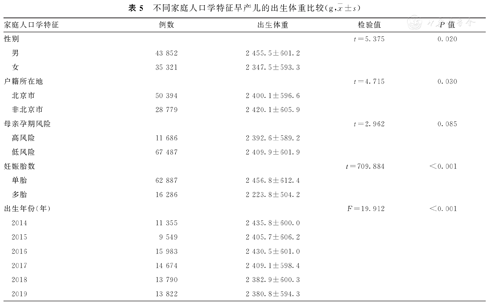 男性、非北京市户籍、单胎妊娠早产儿的出生体重,分别显著高于女性、北京市户籍、多胎妊娠早产儿的出生体重,并且差异均有统计学意义(P<0.05)。2014—2019年,不同年份出生早产儿的出生体重总体比较,差异有统计学意义(P<0.001)。不同家庭人口学特征早产儿的出生体重比较,见表5。