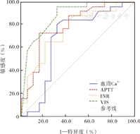 预测FM患儿死亡指标的ROC曲线分析结果显示,血乳酸、pH值、碱剩余、血清Ca2+、INR、APTT和VIS分别预测FM患儿死亡的AUC分别为0.776(95%CI:0.621~0.890,P<0.001),0.804(95%CI:0.664~0.905,P<0.001),0.829(95%CI:0.692~0.922,P<0.001),0.702 (95%CI:0.559~0.821,P=0.016),0.753 (95%CI:0.602~0.869,P=0.001),0.791 (95%CI:0.644~0.898,P<0.001)和0.890 (95%CI:0.774~0.959,P<0.001),见图1、图2。根据约登指数最大原则,血乳酸、pH值、碱剩余、血清Ca2+、INR、APTT和VIS对于预测FM患儿死亡的最佳临界值,分别为3.60 mmol/L、7.18、-5.20 mmol/L、1.94 mmol/L、1.31、36.30 s和20.00分,此时预测FM患儿死亡的敏感度分别为60.9%、96.2%、61.5%、83.3%、65.4%、73.1%和96.7%,特异度分别为89.5%、50.0%、95.4%、68.2%、78.9%、84.2%和65.2%,见表6。
