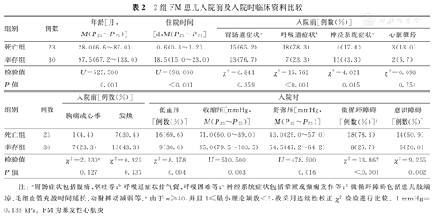 2组FM患儿入院前及入院时临床资料比较