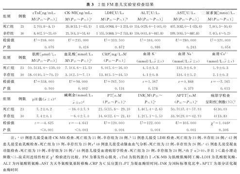 53例患儿的血清ctnI水平均升高。接受血清CK-MB检查49例患儿中,47例增高(3.58~ 985.94 ng/mL);接受血清病原学检查的48例患儿中,10例呈阳性(肺炎支原体、柯萨奇病毒及副流感病毒IgM抗体呈阳性分别为5、2及3例)。接受血清脑钠肽(brain natriuretic peptide,BNP)检查的25例患儿中,23例升高(384.1~35 000.0 pg/mL)。2组患儿血乳酸、血清Ca2+、动脉血pH值及碱剩余,以及凝血酶原时间(prothrombin time,PT),国际标准化比率(international normalized ratio,INR),活化部分凝血酶原时间(activated partial thromboplastin time, APTT)比较,差异均有统计学意义(P<0.05)。2组患儿cTnI、CK-MB、LDH、ALT、AST、尿素氮、肌酐、CRP、血清K+、血清Na+和血清病原学检查呈阳性者所占比例比较,差异均无统计学意义(P>0.05)。2组FM患儿实验室检查结果,见表3。
