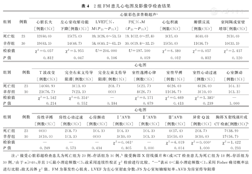 注:a接受心脏彩超检查患儿为死亡组为20例,存活组为30例。b接受胸部X射线摄片和(或)CT检查患儿为死亡组为18例,存活组为30例。c由于n≥40,并且1≤最小理论频数<5,故采用连续性校正χ2检验进行比较。"—"表示0<最小理论频数<1,采用Fisher确切概率法进行比较,故无具体χ2值。FM为暴发性心肌炎。LVEF为左心室射血分数,FS为心室短轴缩短率,AVB为房室传导阻滞