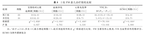 对2组患儿均进行综合治疗,其中临时心脏起搏器使用率、VIS比较,差异均有统计学意义(P<0.05),而2组患儿接受血液净化治疗所占比例,心脏电复律和ECMO使用率比较,差异均无统计学意义(P>0.05)。2组FM患儿治疗情况比较,见表5。