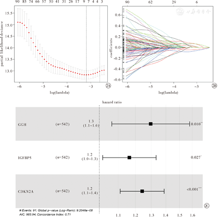 注:EC为子宫内膜癌。GGH为γ-谷氨酰水解酶,IGFBP5为胰岛素样生长因子结合蛋白5,CDKN2A为细胞周期蛋白依赖性激酶抑制剂2A。log(lambda)为惩罚系数,partial likelihood deviance为部分似然偏差,coefficients为系数,hazard ratio为风险比