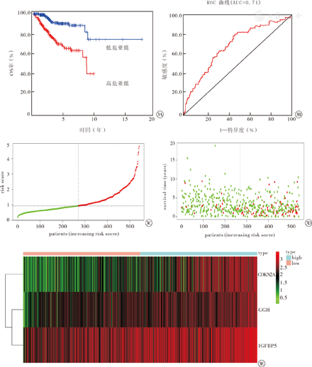 注:EC为子宫内膜癌。OS为总体生存,ROC曲线为受试者工作特征曲线,AUC为曲线下面积。GGH为γ-谷氨酰水解酶,IGFBP5为胰岛素样生长因子结合蛋白5,CDKN2A为细胞周期蛋白依赖性激酶抑制剂2A。patients (increasing risk score)为患者(风险评分增加),risk score为风险评分,survival time (years)为生存时间(年)