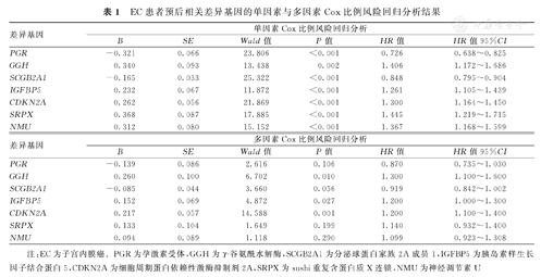 EC患者预后相关差异基因的单因素与多因素Cox比例风险回归分析结果