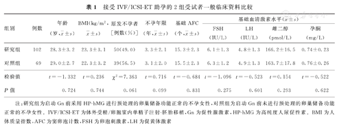 接受IVF/ICSI-ET助孕的2组受试者一般临床资料比较