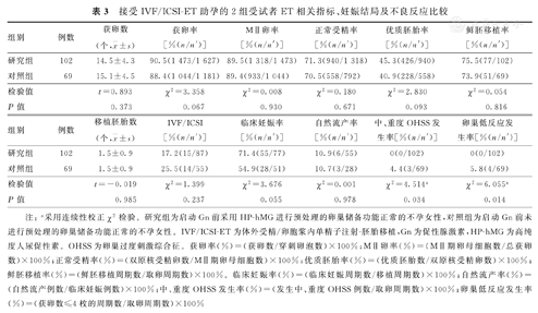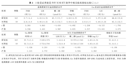 2组受试者接受IVF/ICSI-ET助孕中相关临床指标比较(