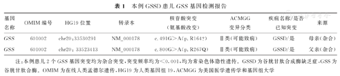 | GSS | 601002 | chr20:33530291 | NM_000178 | c.491G>A(p.R164?) | Ⅱ类(可能致病) | GSSD/是 | 母亲(杂合) |