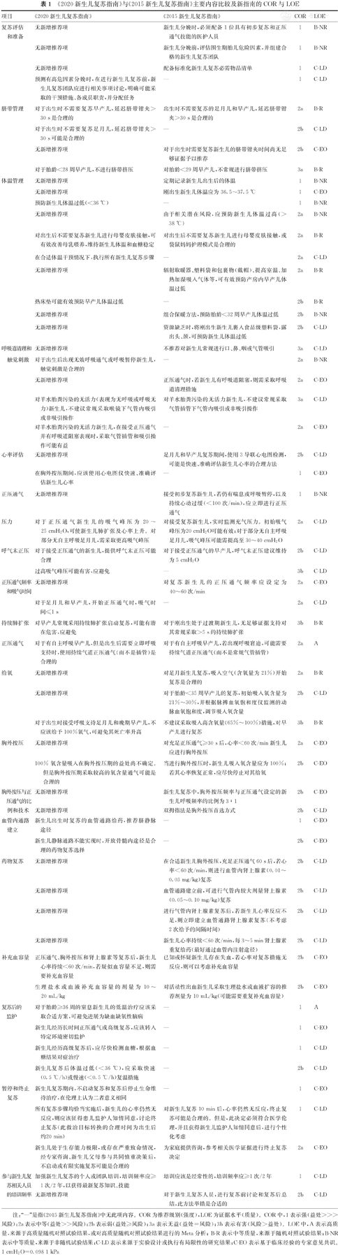 《2020新生儿复苏指南》与《2015新生儿复苏指南》主要内容比较及新指南的COR与LOE