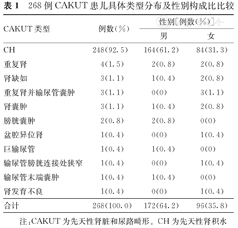 268例CAKUT患儿具体类型分布及性别构成比比较