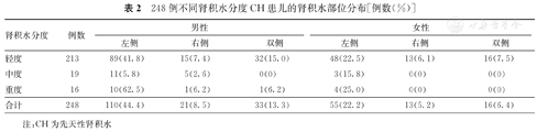 248例不同肾积水分度CH患儿的肾积水部位分布[例数(%)]