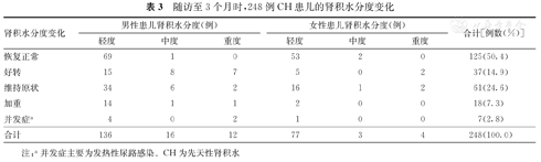 随访至3个月时,248例CH患儿的肾积水分度变化