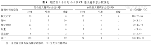对248例CH患儿随访至6个月时,213例轻度CH患儿中,170例(68.5%)恢复正常,4例(1.6%)加重,另有15例(6.0%)并发发热性UTI,复查泌尿系超声时,仍见肾盂扩张;19例中度CH患儿中,11例恢复正常或好转(57.9%,11/19);16例重度CH患儿中,好转为12例,无一例恢复正常,3例并发发热性UTI。随访至6个月时,248例CH患儿肾积水分度变化,见表4。