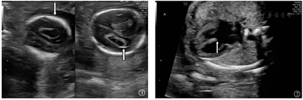 本组175例中孕期18-TS胎儿中,169例(96.6%)的胎儿超声表现异常,其余6例(3.4%)未见异常。超声表现异常胎儿中,157例(89.7%)异常≥2项。在结构异常胎儿中,心脏畸形(131例、74.9%),肢体畸形(113例、64.6%),面部畸形(90例、51.4%)与中枢神经系统异常(60例、34.3%)最为常见。超声软指标异常胎儿中,脉络丛囊肿(116例、66.3%)(图1)最为常见,其次为单脐动脉(54例、30.9%)。非特异性超声异常胎儿中,羊水过多(13例、7.4%)与宫内生长受限(11例、6.3%)最为常见。本组175例中孕期18-TS胎儿超声表现,见表1。