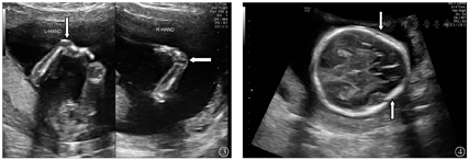 本组175例中孕期18-TS胎儿最常见超声结构异常(心脏、肢体、面部畸形及中枢神经系统异常)胎儿中,心脏畸形以室间隔缺损最为常见(70例、40.0%),其次为心内膜垫缺损(28例、16.0%)(图2);肢体畸形以钩状手(第3、4指紧贴手掌,第2、5指压在其上)最为常见(35例、20.0%)(图3),其次为重叠指(28例、16.0%);面部畸形以小下颌(43例、24.6%)最为常见;中枢神经系统异常以草莓头(33例、18.9%)(图4)最为常见。本组175例中孕期18-TS胎儿最常见超声结构异常心脏、肢体、面部畸形及中枢神经系统异常分布情况,见表2。