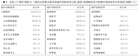 本组175例中孕期18-三体综合征胎儿最常见超声结构异常心脏、肢体、面部畸形及中枢神经系统异常分布情况[例数(%)]