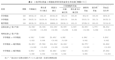 晚孕期组孕妇贫血3项指标异常发生率、叶酸缺乏性巨幼细胞性贫血及缺铁性贫血发生率,以及贫血总发生率,均分别高于早、中孕期组;中孕期组上述发生率,均高于早孕期组,并且差异均有统计学意义(P<0.05)。早、中、晚孕期组孕妇维生素B12缺乏性巨幼细胞性贫血及混合性贫血发生率比较,差异均无统计学意义(P>0.05)。3组孕妇贫血3项指标异常及贫血发生率比较,见表2。