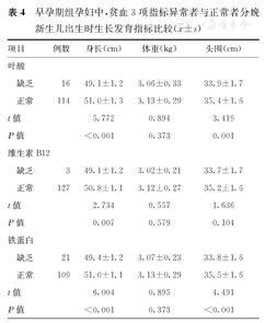 早、中、晚孕期组孕妇中,贫血3项指标异常者与正常者分娩新生儿出生时生长发育指标比较结果如下。①身长比较:这3组孕妇中,贫血3项指标异常(叶酸/维生素B12/铁蛋白缺乏)者分娩新生儿的身长,均短于指标正常者分娩新生儿,并且差异均有统计学意义(P<0.05)。②出生体重比较:晚孕期组孕妇中,铁蛋白缺乏者分娩新生儿出生体重,轻于铁蛋白正常者分娩新生儿,并且差异有统计学意义(P<0.05);其余情况下,贫血3项指标异常者与正常者分娩新生儿出生体重比较,差异均无统计学意义(P>0.05)。③头围比较:早孕期组孕妇中,维生素B12缺乏者与正常者,以及晚孕期组孕妇中,铁蛋白缺乏者与正常者分娩新生儿出生时头围比较,差异均无统计学意义(P>0.05);其余情况下,贫血3项指标异常者分娩新生儿出生时头围,均小于正常者分娩新生儿,并且差异均有统计学意义(P<0.05)。早、中、晚孕期组孕妇中,贫血3项指标异常者与正常者分娩新生儿出生时生长发育指标比较,见表4,表5,表6。