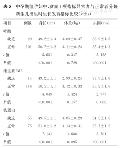 晚孕期组孕妇中,贫血3项指标异常者与正常者分娩新生儿出生时生长发育指标比较(