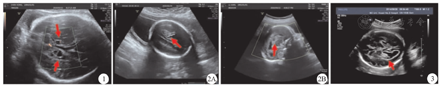 纳入研究的40例FICH胎儿中,胎儿超声检查提示FICH为33例,包括室管膜下稍强回声(3例)、无回声(1例);脑室内稍强回声(10例)、不均匀回声(2例);脉络丛稍强回声(2例)、无回声(2例)、弱回声(1例)、不均匀回声(3例);脑实质稍强回声(3例)、无回声(2例)、弱回声(2例)、不均匀回声(2例)。胎儿超声对FICH内部及周边均未探及血流信号。其余7例胎儿超声检查结果均提示颅内结构异常。33例FICH胎儿的超声检查头颅声像特征,见表1及图1,图2,图3,图4。
