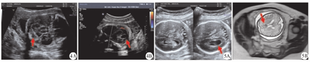 FICH的MRI具有较突出特征[17]。MRI对软组织分辨率高,可多切面及多序列成像,是诊断胎儿软组织异常的重要影像学手段[18]。MRI对FICH可精准定位,可判断脑实质损伤情况[5]。MRI虽然对FICH较为敏感,但是具有检查费用较高、易受胎动影响、不能实时动态成像、显示室管膜及脉络丛不及超声图像清晰等缺点[19],而且受试者合并幽闭恐惧症,体内含有金属等为MRI禁忌证[20],因此目前临床诊断FICH的首选检查手段仍是超声检查,对于超声检查切面显示困难者,再选择MRI作为补充检查。本研究结果显示,中孕期胎儿超声及MRI对FICH检出率比较,差异无统计学意义(P=0.500),这可能与中孕期超声对胎儿颅内结构显示清晰,颅脑扫查切面较多且标准有关;而晚孕期胎儿超声对FICH检出率低于MRI,并且差异有统计学意义(P<0.05),这可能为胎头位置低或已入盆、颅骨钙化等有关。
