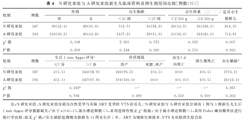 注;N研究亚组、A研究亚组分别为自然受孕与采取ART受孕的VTS存活儿。aN研究亚组与A研究亚组分别有1例与3例新生儿生后1 min Apgar评分数据缺失;b由于n≥40,1≤最小理论频数<5,采用连续性校正χ2检验;c由于最小理论频数<1,采用Fisher确切概率法进行统计学比较,故无χ2值;d出生缺陷监测期为胎龄为14周至生后1年。ART为辅助生殖技术,VTS为双胎消失综合征