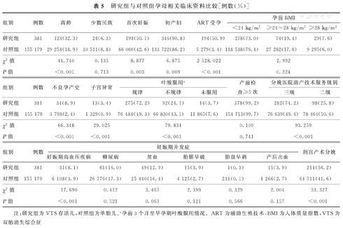 研究组孕母高龄、首次妊娠、初产妇、ART受孕、不良孕产史、子宫异常史、孕前3个月至早孕期规律服用叶酸、三级助产技术服务机构分娩、妊娠期高血压疾病、剖宫产术分娩占比,均显著高于对照组,并且差异均有统计学意义(P<0.001)。2组孕母少数民族占比、孕前BMI构成比、孕期产前检查≥5次比例及妊娠期糖尿病、贫血、胎膜早破、胎盘早剥、产后出血发生率分别比较,差异均无统计学意义(P>0.05)。2组孕母相关临床资料比较,见表5。