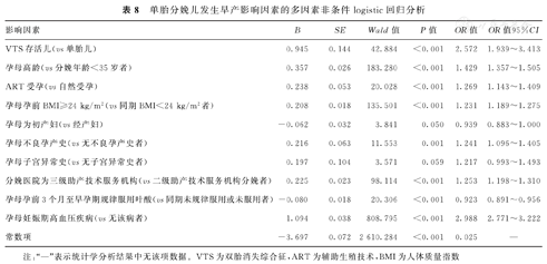 注:"—"表示统计学分析结果中无该项数据。VTS为双胎消失综合征,ART为辅助生殖技术,BMI为人体质量指数