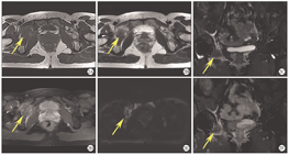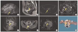 这11例UEC/DEC患者占本院同时期确诊为子宫内膜癌患者的1.8%(11/629),其一般临床、实验室、影像学及病理学检查结果如下。①临床资料:确诊时11例UEC/DEC患者的中位年龄为50岁(43~65岁),中位BMI为24.7 kg/m2;绝经后患者为8例,围绝经期为1例;有糖尿病者为2例;3代以内直系亲属有肿瘤史者为5例;手术方式为经腹者为5例,经腹腔镜者为6例;FIGO临床分期为早期(Ⅰ~Ⅱ期)者为6例,晚期(Ⅲ~Ⅳ期)者为5例。5例FIGO Ⅲ~Ⅳ者中,1例(No.3)伴腹主动脉旁淋巴结转移,2例(No.7、9)伴子宫外盆腔扩散,1例(No.2)同时伴卵巢和腹主动脉旁淋巴结转移,1例(No.8)伴远处髋臼转移。②主要临床表现:阴道不规则流血者为9例,下腹胀痛者为2例。③实验室检查结果:4例(No.2~3、9~10)患者血清肿瘤标志物糖类抗原(carbohydrate antigen,CA)125,人附睾蛋白(human epididymis protein,HE)4水平升高。④影像学检查结果:11例UEC/DEC患者的超声检查提示子宫内膜增厚或宫腔内有不均质回声团(图1A);MRI结果提示子宫内膜不规则增厚或宫腔内占位,呈等T1、稍长T2信号影,弥散加权序列上呈明显的高信号,表观弥散系数图呈低信号,增强扫描可见病灶强化(图1B,图1C,图1D,图1E,图1F,图1G)。1例(No.8)患者初诊时,MRI检查见右侧髋臼下缘不规则斑片状等T1、短T2信号影,DWI序列呈高信号,增强扫描见不均质强化,伴周围软组织肿胀(图2),经皮右侧髋臼穿刺病理学检查结果证实为DEC的未分化组分(undifferentiated components,UC)转移至髋臼。⑤术前组织病理学检查结果:10例(No.1、3~11)患者术前行子宫内膜活组织病理学检查,2例(No.7~8)确诊为DEC,2例(No.1、3)为子宫内膜腺癌,5例(No.4~6、10~11)为低分化子宫内膜癌,1例(No.9)为子宫内膜息肉,1例(No.2)未行子宫内膜活组织病理学检查。⑥术后病理学检查结果:3例(No.3~4、11)为UEC,8例(No.1~2、5~10)UC合并低级别子宫内膜样癌成分,3例(No.1、3、6)UC合并高级别子宫内膜样癌成分,其中1例(No.3)同时还合并高级别浆液性癌成分;肿瘤最大直径≤2 cm为2例(No.1~2),>2 cm为9例(No.3~11),其中1例DEC患者(No.8)子宫切除后剖视可见宫腔内病灶大小约为2.2 cm×1.8 cm×1.2 cm,累及子宫壁>1/2肌壁全层(图1H);肌层浸润深度<1/2为7例(No.2~5、7、10~11),≥1/2为4例(No.1、6、8~9);11例患者均无盆腔淋巴结转移;腹主动脉旁淋巴结转移为2例(No.2~3),淋巴脉管间隙浸润为5例(No.4、6、8~10)。