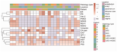 对所有患者进行上皮标志物细胞角蛋白(cytokeratin,CK),雌激素受体(estrogen receptor,ER),孕激素受体(progesterone receptor,PR),配对盒8基因(paired box protein,Pax8)等IHC染色。所有组织切片经苏木素-伊红(hematoxylin-eosin, HE)染色及IHC染色,染色结果由本院2位高年资病理科医师进行复核后确定病理学结果。根据IHC染色阳性细胞在全部细胞中所占比例(染色阳性细胞率)判定结果:①染色阳性细胞率<5%者,判断为IHC染色结果呈阴性(-);②为5%~25%者,判断为灶性表达(±);③为26%~50%者,判断为斑驳状表达(+);④为51%~75%者,判断为片状表达(++);⑤>75%者,判断为弥漫表达(+++)[8]。对IHC染色结果,根据表达强度进行颜色编码,并绘制热图。