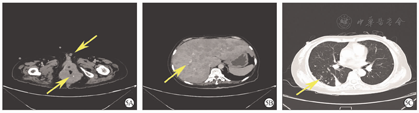 对这11例患者随访至2022年3月31日,随访时间为3~34个月。其中,2例患者(No.2、9)分别为FIGO ⅢC2期及ⅢB期(No.9),均死于DEC。No.2患者术后接受放、化疗6个月后,出现腹腔内广泛转移导致肠梗阻而死亡,OS期为9个月。No.9患者于术后1个月出现高钙血症及肿瘤广泛转移(阴道、直肠、肛管、膀胱后壁、阴阜、肝、肾上腺、双肺)(图5),阴道肿块经穿刺活组织病理学检查结果证实为UEC转移后,2个月死亡,OS期为3个月。6例(No.1、4~6、10~11)FIGO Ⅰ~Ⅱ期患者截至发稿均无瘤存活。目前存活的9例患者(No.1、3~8、10~11)中,OS期最长者已达34个月,中位OS期为10.5个月。