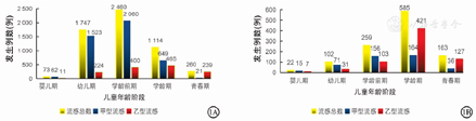 本研究结果如下。①NPIs实施前与NPIs实施后,流感患儿男、女性别构成比分别为59.0%(3 336/5 654)、41.0%(2 318/5 654)与59.3%(671/1 131)、40.7%(460/1 131);流感患儿性别构成比比较,差异无统计学意义(χ2=0.04,P=0.839)。②2017—2022年,甲型流感患儿以婴儿期+幼儿期+学龄前期儿童为主,占比为81.7%(3 887/4 757),乙型流感则以学龄期+青春期儿童为主,占比为61.7%(1 252/2 028)。③NPIs实施前,成都市儿童流感以甲型流感病毒感染为主,占比为76.3%(4 315/5 654),乙型流感病毒感染则占比为23.7%(1 339/5 654);NPIs实施后,成都市儿童流感以乙型流感病毒感染为主,占比为60.9%(689/1 131),甲型流感病毒感染则占比为39.1%(442/1 131)。④NPIs实施前,流感患儿年龄为2月龄至17.9岁,中位年龄为5.5岁,流感多发生于婴儿期、幼儿期及学龄前期儿童,占比为75.7%(4 280/5 654);NPIs实施后,流感患儿年龄为1月龄至16.8岁,中位年龄为8.6岁,流感多发生于学龄期及青春期儿童,占比为66.1%(748/1 131)。NPIs实施前、后成都市流感儿童年龄分布柱状图,见图1。