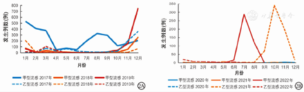 成都市采取NPIs措施防治COVID-19疫情前、后,4家医院监测到的流感病毒流行情况如下。①2017—2022年,4 757例甲型流感患儿中,每年占比依次为58.86%(2 800/4 757)、10.05%(478/4 757)、21.80%(1 037/4 757)、0.19%(9/4 757)、0.08%(4/4 757)、9.02%(429/4 757);2 028例乙型流感患儿中,每年占比依次为41.81%(848/2 028)、15.09%(306/2 028)、9.12%(185/2 028)、0.15%(3/2 028)、31.71%(643/2 028)、2.12%(43/2 028)。②NPIs实施前,成都市儿童以甲型流感病毒感染为主,2017年多发生于春季(2~4月)及秋季(8~10月),2018、2019年感染甲型流感病毒多发生于冬季(11月至次年2月)。③NPIs实施后,2020年儿童流感为明显低水平发病,甲、乙型流感病毒感染交替流行;2021年乙型流感病毒流行,占比为99.38%(643/647),流行季节为秋冬季(9~12月);2022年甲型流感病毒流行,占比为0.9%(429/472),流行季节为夏秋季(6~9月)。NPIs实施前、后成都市儿童甲、乙型流感流行情况,见图2。