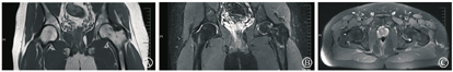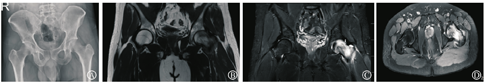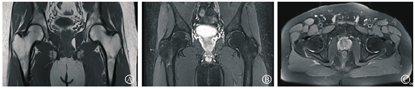治疗上采取非甾体消炎药物(塞来昔布)+降钙素类药物(依降钙素注射液,每周2次,肌肉注射)+骨化三醇胶囊的联合治疗。患者两周复诊一次,每次复诊症状、体征均有明显好转。经过4个月治疗该患者于2018年9月复诊时症状体征完全消失,复查双侧髋关节MRI显示双侧髋关节在位,关节间隙存在,未见明显狭窄;左侧髋关节腔内见少量液体信号影,左侧股骨头颈部骨髓水肿基本消失(图3)。