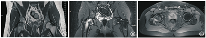 MRI是早期发现BMES最敏感的检查方法,主要为局部骨髓水肿征象及邻近关节腔积液征象。表现为弥漫性、边界不清、高低不均的骨髓异常信号,呈T1WI低信号,T2WI略高信号或高信号,STIR高信号。这种信号异常代表骨髓细胞外液的增多,其增多的程度和数量决定水肿的范围和异常信号的高低。患者疼痛与骨髓水肿程度程正相关。异常信号可以累及股骨上端局部,也可累及整个股骨上端的股骨头、颈、粗隆部。