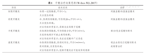 牙髓炎症状态与其对应组织病理学形态之间具有良好的相关性[10],但这一金标准对于临床上准确及时判断牙髓状态来说并不现实。Wolters等[11]综合前人研究,在Hashem等[12]研究的基础上,结合实际临床病例的分析,提出了由临床症状预测牙髓状态进而指导牙髓治疗决策的思路,根据牙齿对冷热刺激、叩诊的反应、疼痛性质及其持续时间等临床症状,将牙髓状态分为初期、轻度、中度、重度牙髓炎4个阶段,并希望通过此牙髓炎诊断系统实施新的微创治疗策略。本课题组将该研究结果总结归纳为牙髓治疗决策思路,见表1。