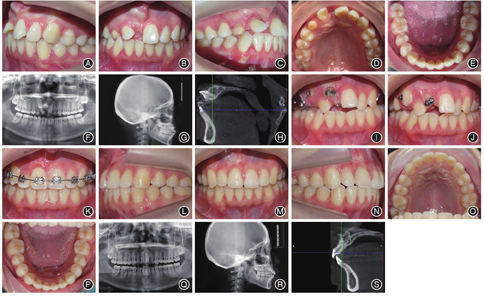 病例1女,21岁,以"自觉门牙不美观数年,要求治疗"为主诉就诊。临床检查:恒牙列,11、13缺失,53滞留,12、21轻度扭转并向缺隙处倾斜、缺牙间隙变小、上中线右偏,11近前庭沟黏膜处可触及牙齿隆起,下牙列轻度拥挤,前牙覆